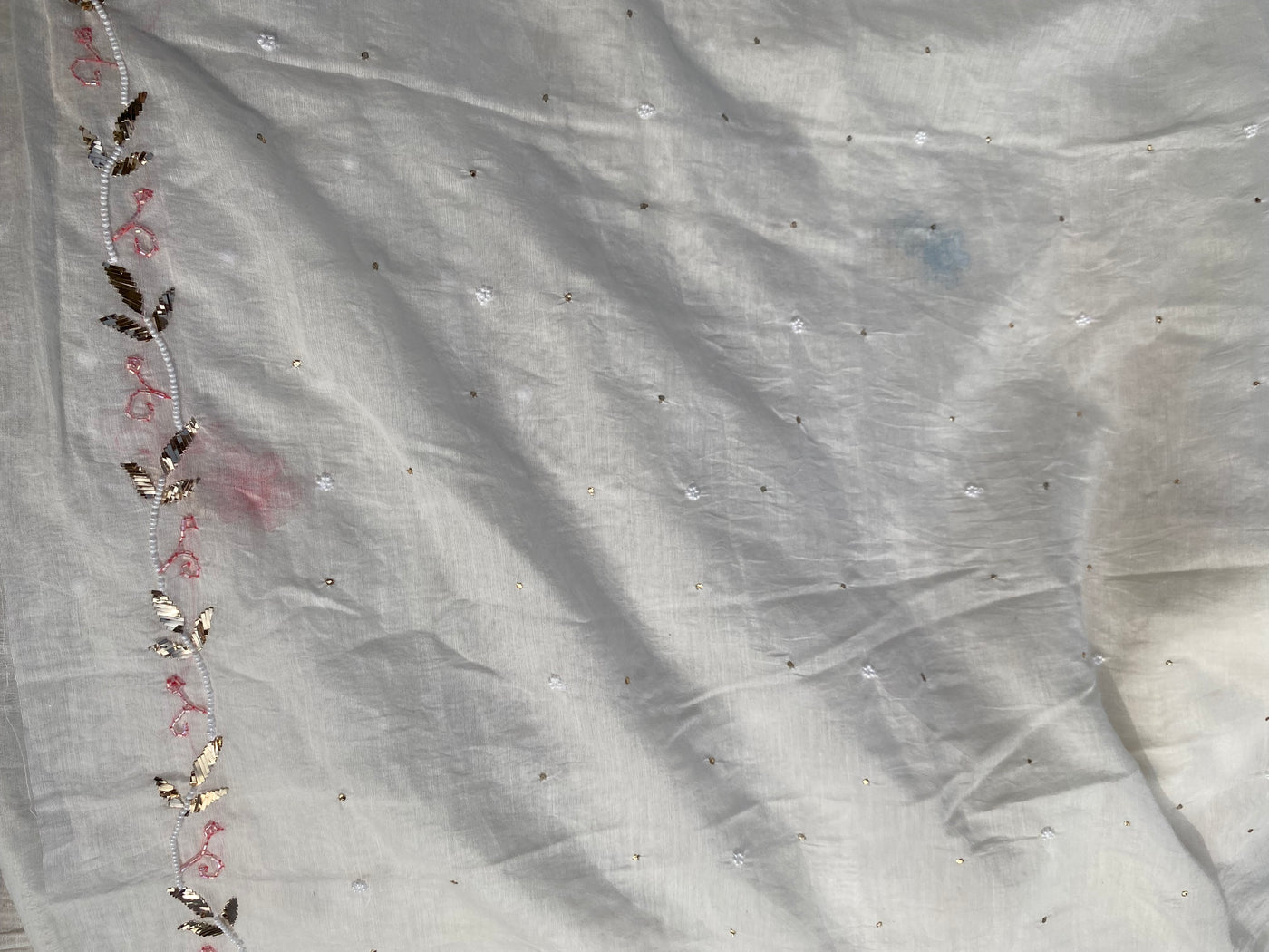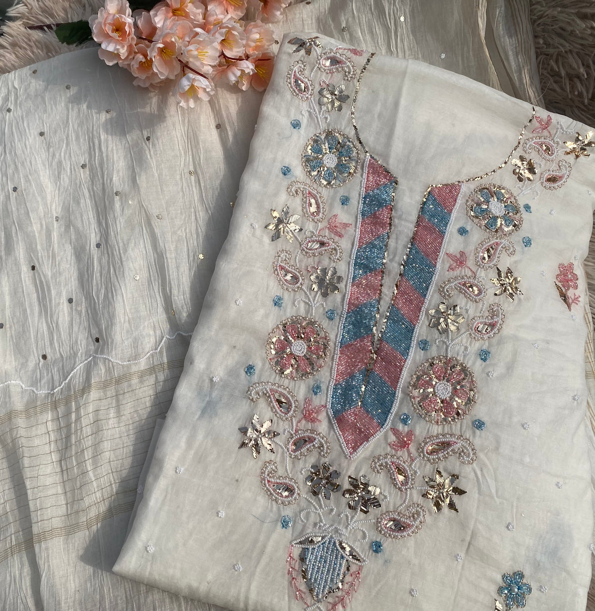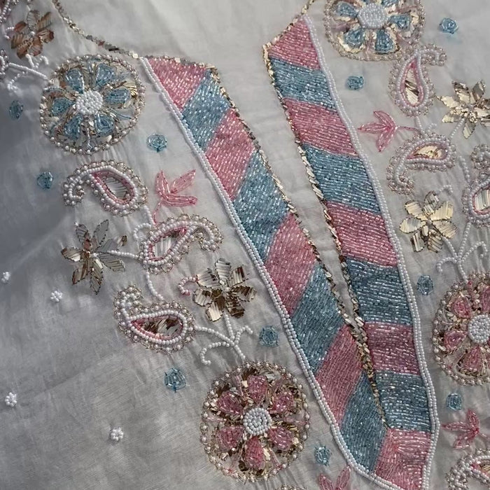 Hand Chikankari with mukaish (metallic dots), cutdana, and bead embroidery, featuring floral and paisley motifs with delicate thread detailing for a rich yet elegant finish.