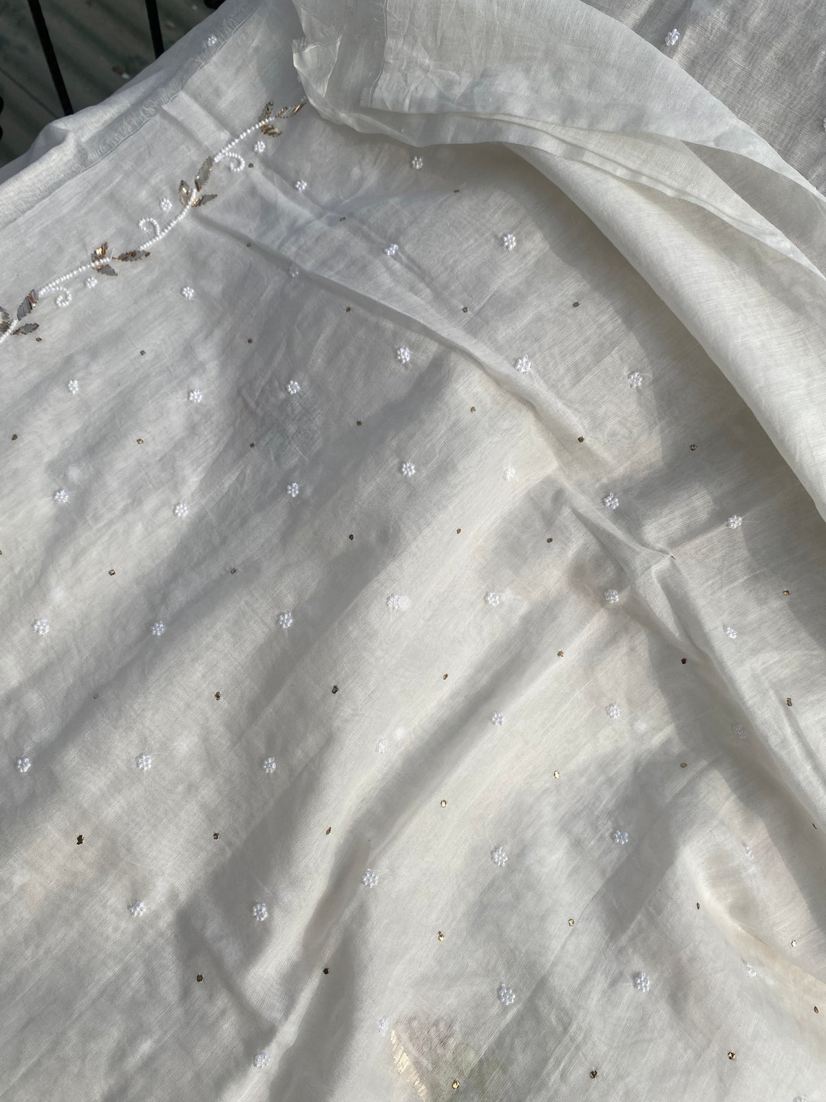Hand Chikankari with mukaish (metallic dots), cutdana, and bead embroidery, featuring floral and paisley motifs with delicate thread detailing for a rich yet elegant finish.