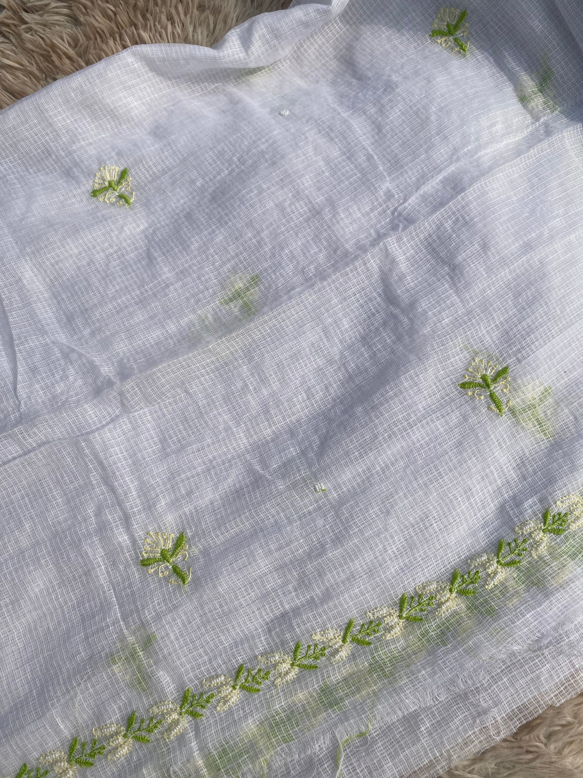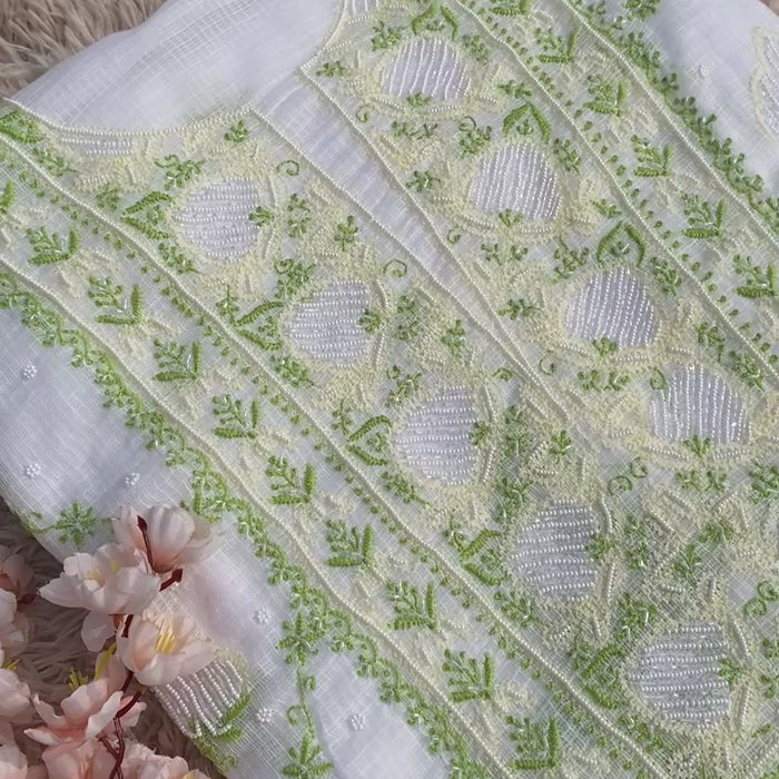 White Kota Doria Chikankari kurti dupatta set with overall jaal and pearl work featuring delicate lime green hand embroidery. Lightweight, breathable fabric with traditional Lucknowi floral motifs, ideal for summer and everyday ethnic wear.