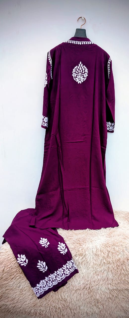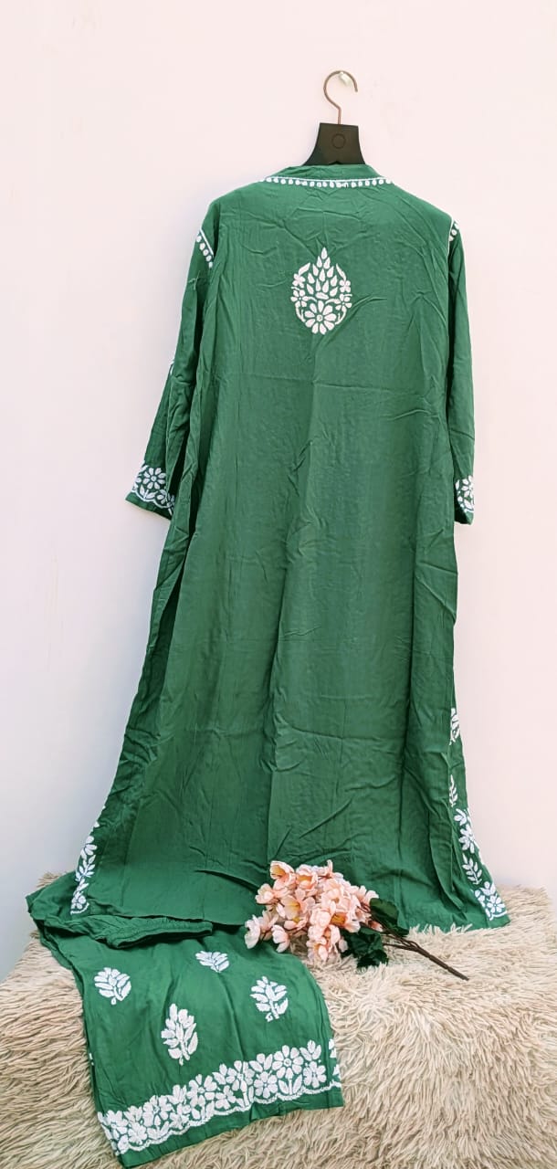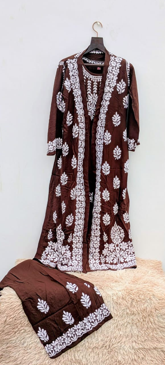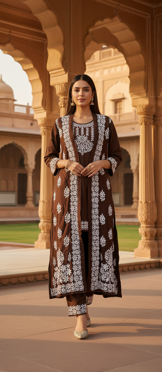 3-Piece Chikankari Set featuring a delicately embroidered top, matching pant, and a detachable shrug. Crafted in soft, breathable fabric with authentic Chikankari work, this versatile set can be styled with or without the shrug—perfect for festive and elegant everyday wear.