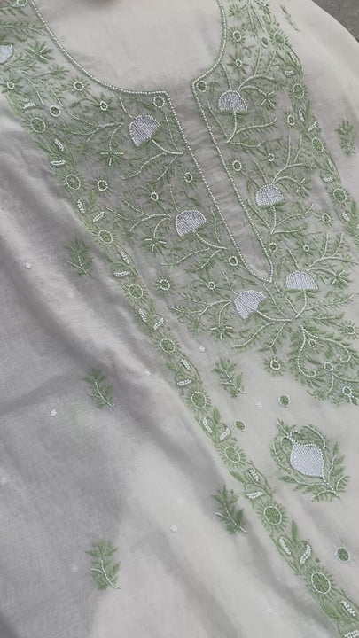 WHITE WITH GREEN MUL CHANDERI UNSTITCHED KURTI WITH DUPATTA SET